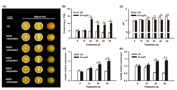 我国柑橘产区总体降雨量大,但夏秋季节性干旱总是规律性发生,夏秋干旱时正值果实膨大期和酸下降期,一段时间的持续干旱对果实膨大和酸积累都影响很大。因此,研究夏秋季节性干旱介导柑橘果实酸化的调控机制对于改良果实品质有重要意义。